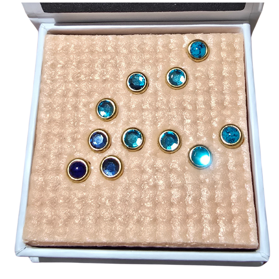 6 Turquoise gems, 2 Dark Blue gems, 2 Turquoise stones and 1 Dark Blue stone all set in gold.