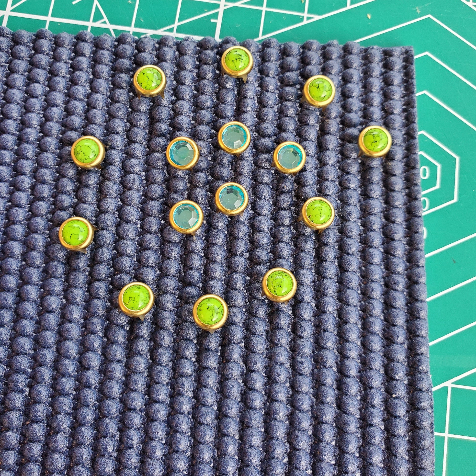 Brass alloy with acrylic gems and faux stones. Designed and assembled in USA, manufactured in China.