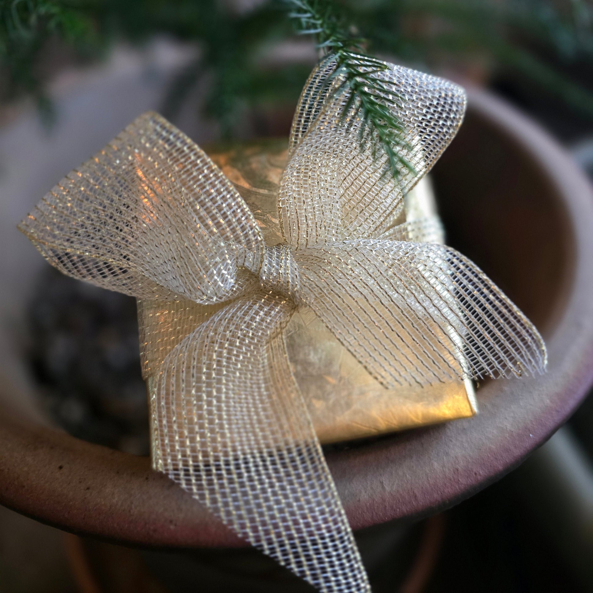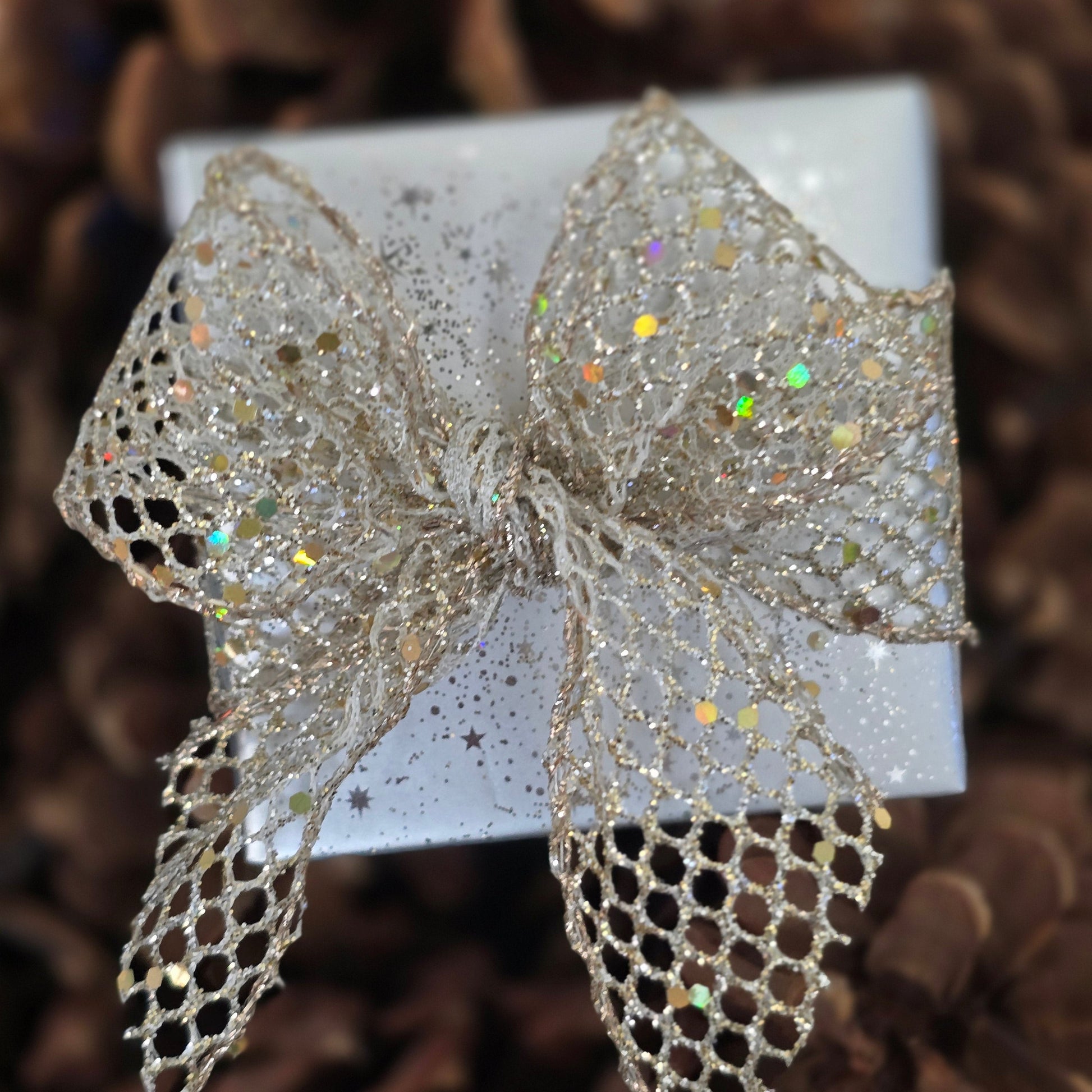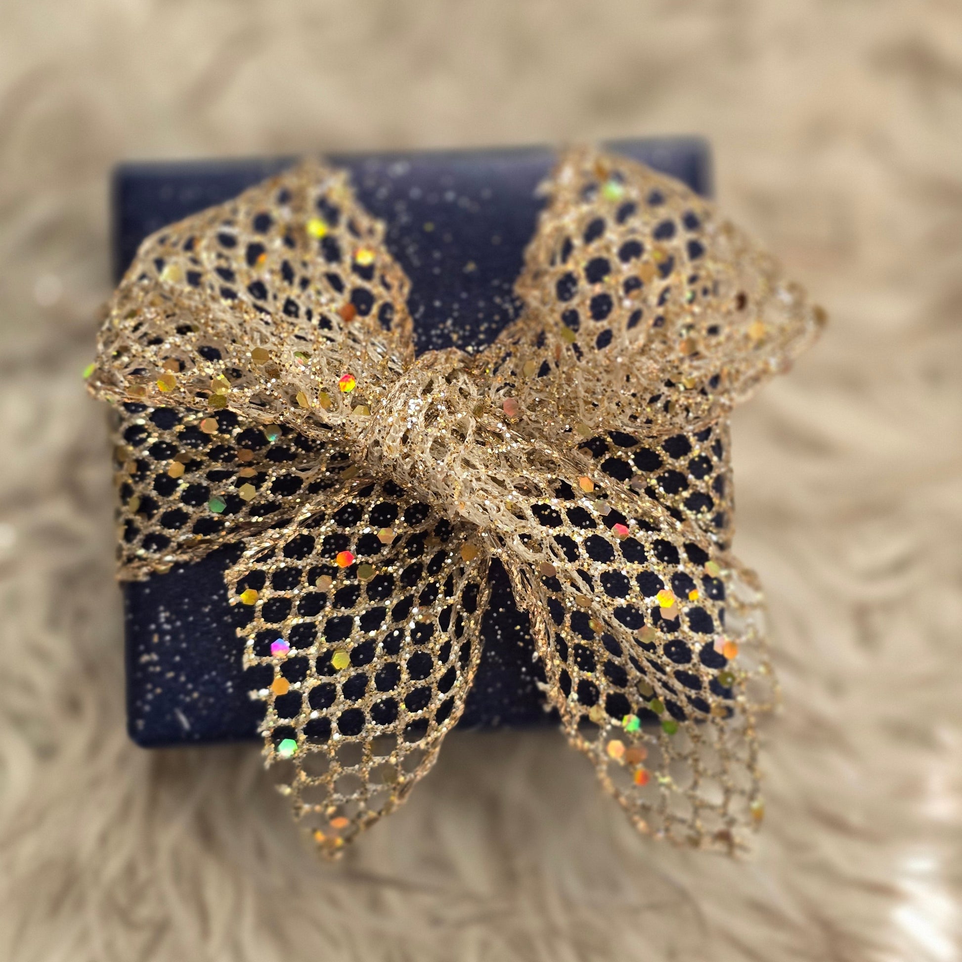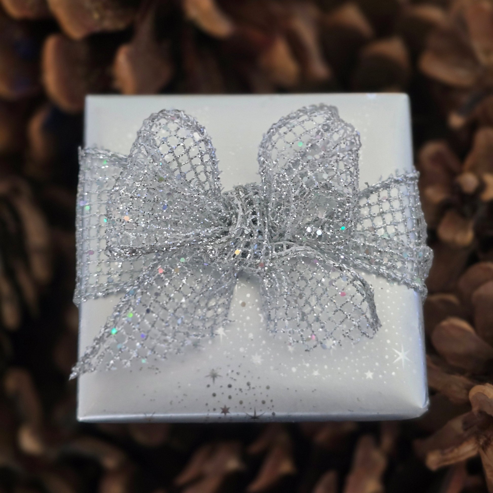 Silver Paper with Red, Gold or Silver wire ribbon OR Blue Paper with Gold or Silver wire ribbon. Paper and ribbon may vary slightly based on availability.