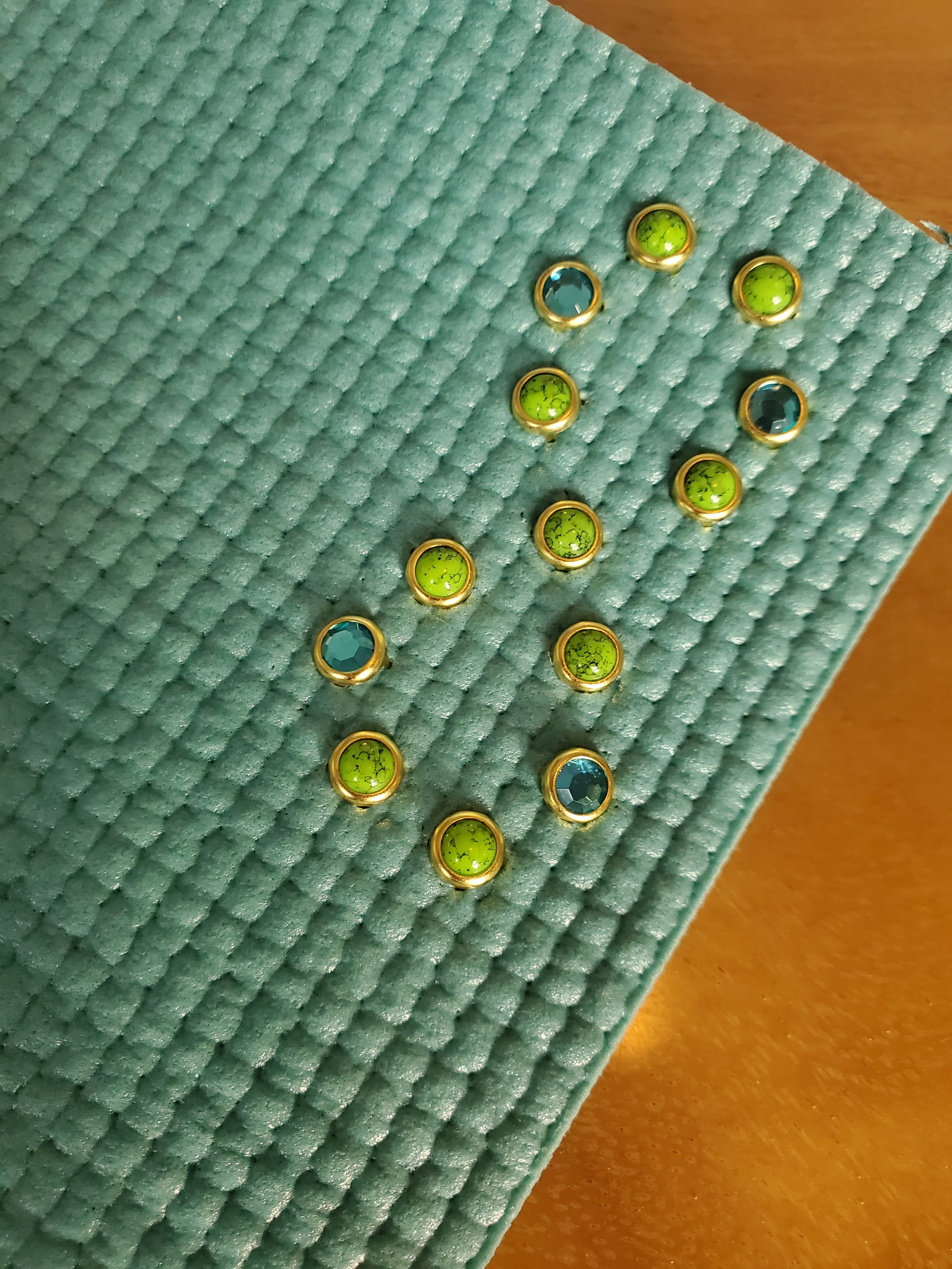 Each piece is beautifully set in gold for a touch of warmth and elegance. Arrange them to reflect a serene beachscape—or let your creativity flow and design your own unique pattern. Add a splash of the seaside to your mat and elevate every session with peace and sparkle.