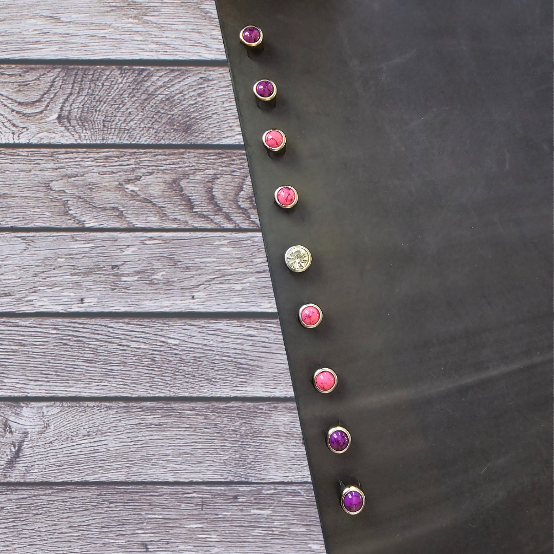Brass alloy with acrylic gems and faux stones. Designed and assembled in USA, manufactured in China.