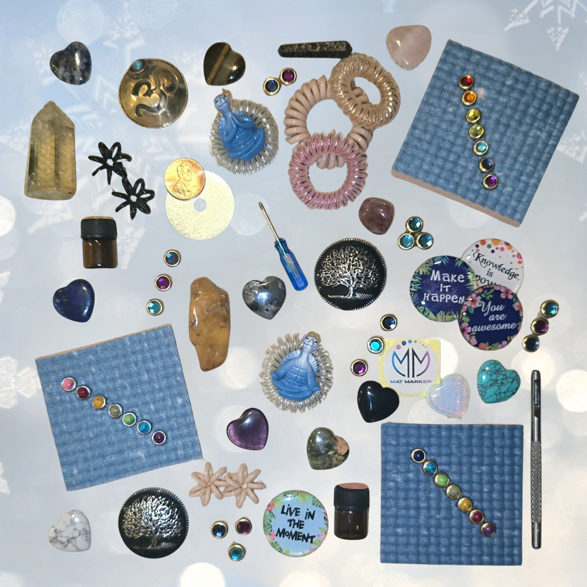 Expect tools, treats, and tiny treasures curated for yogis — from Mat Marker and complementary brands. Each slightly different from the next— with a total retail value of $68 packed into one magical box.